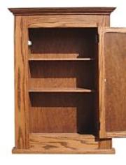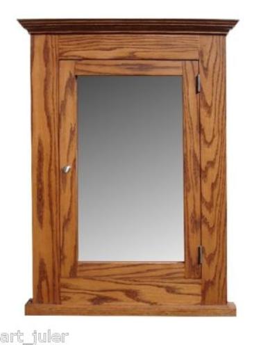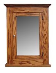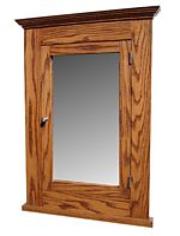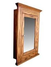 Solid Oak construction features a spacious cabinet behind a mirror door.